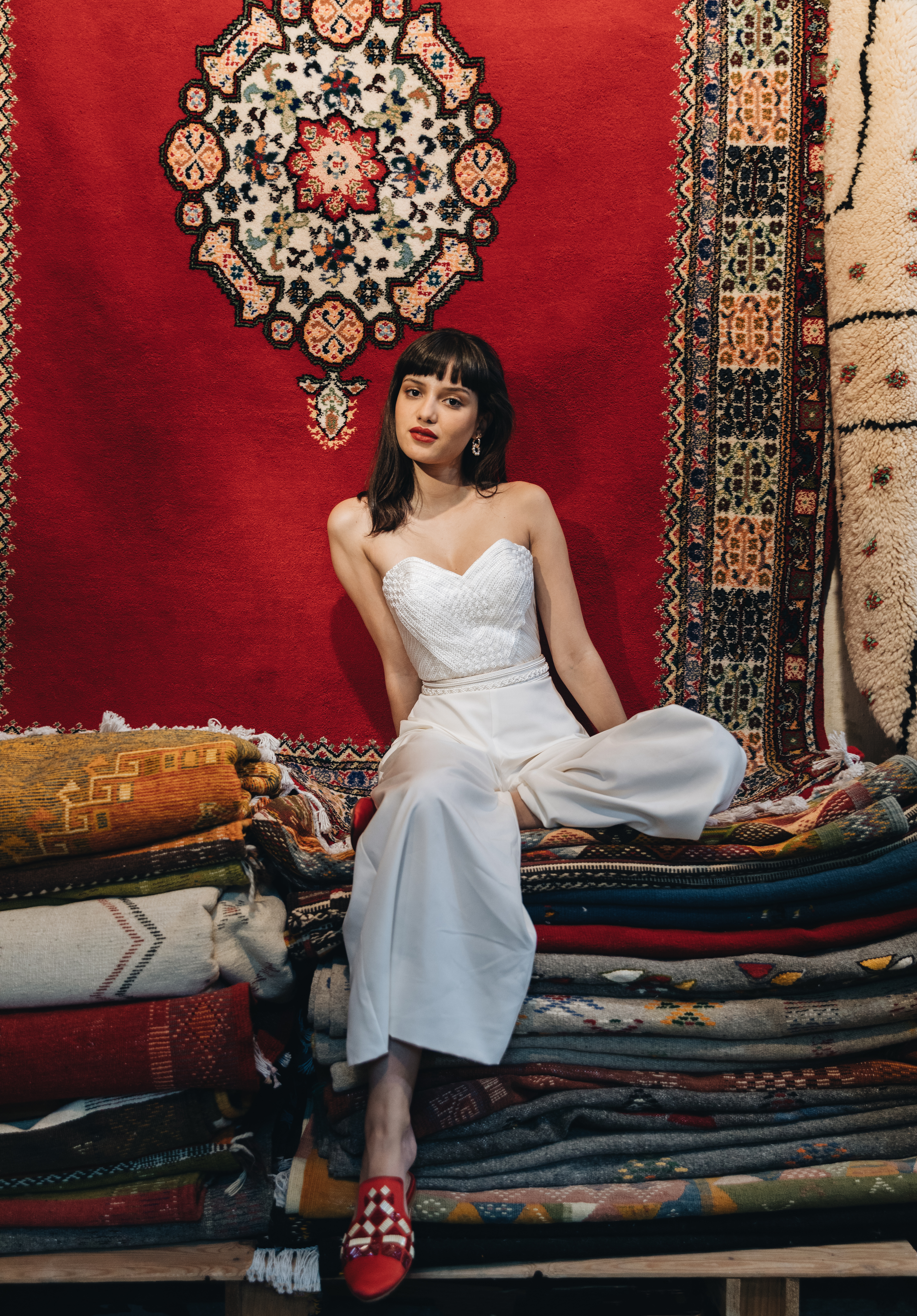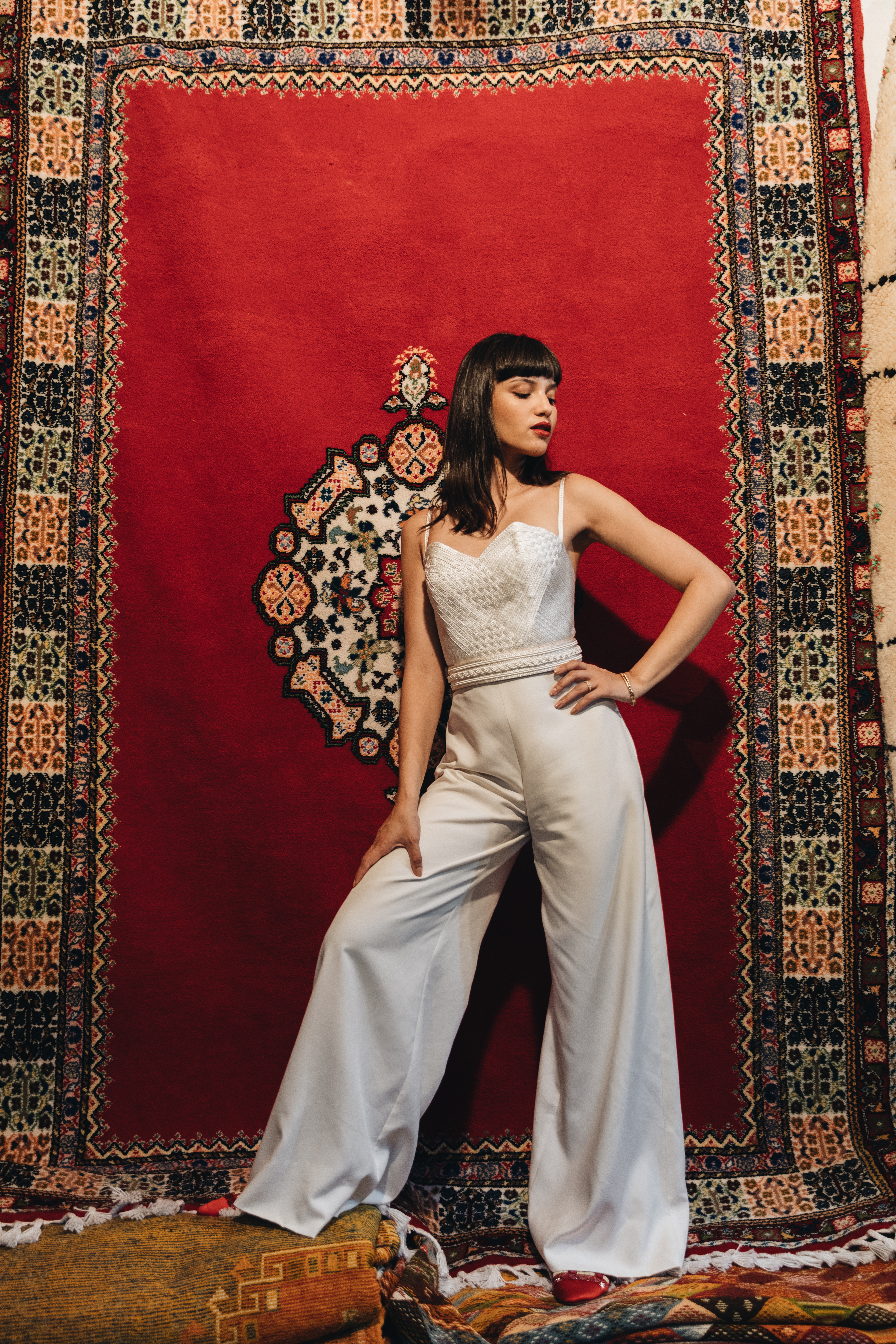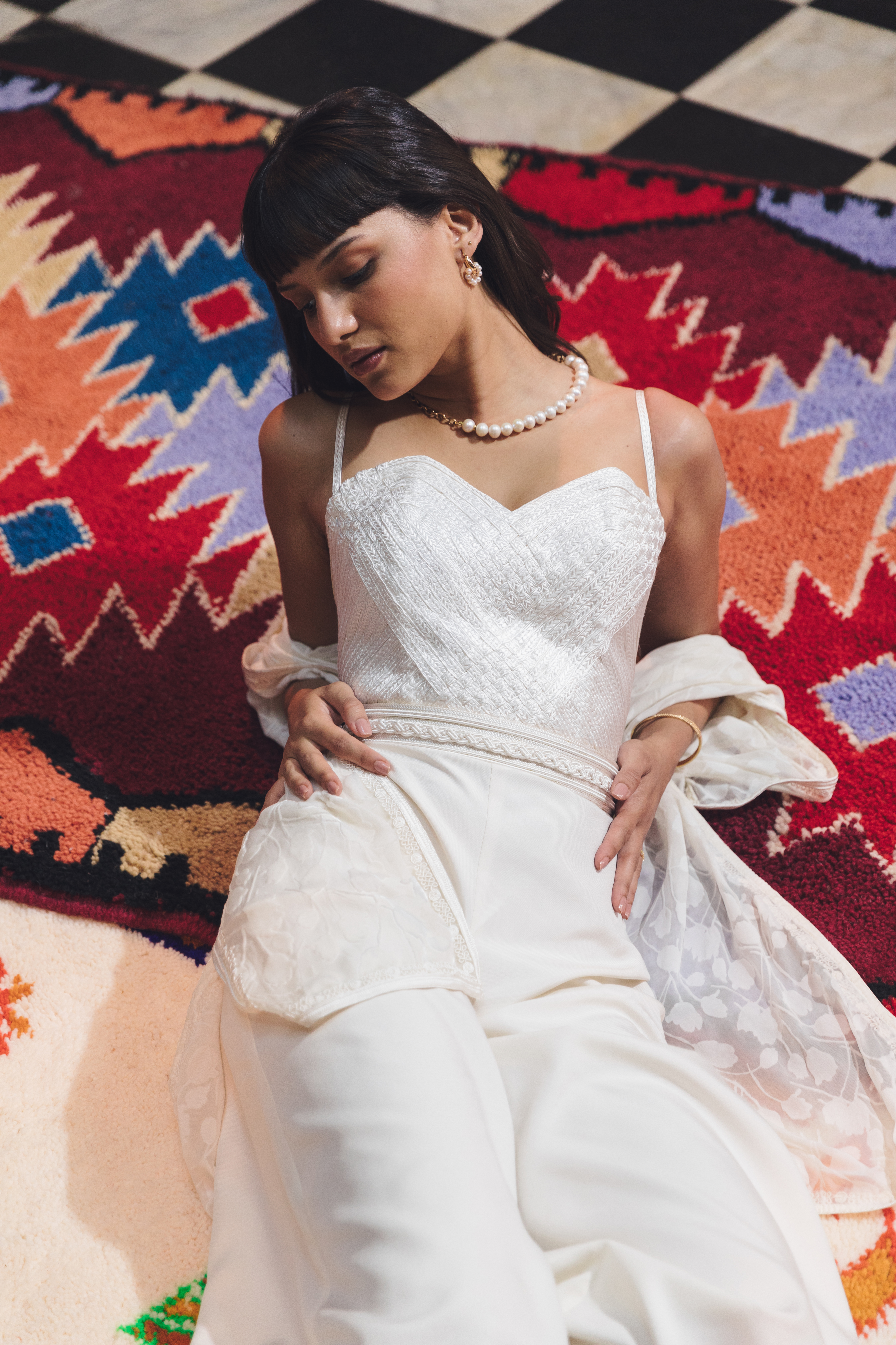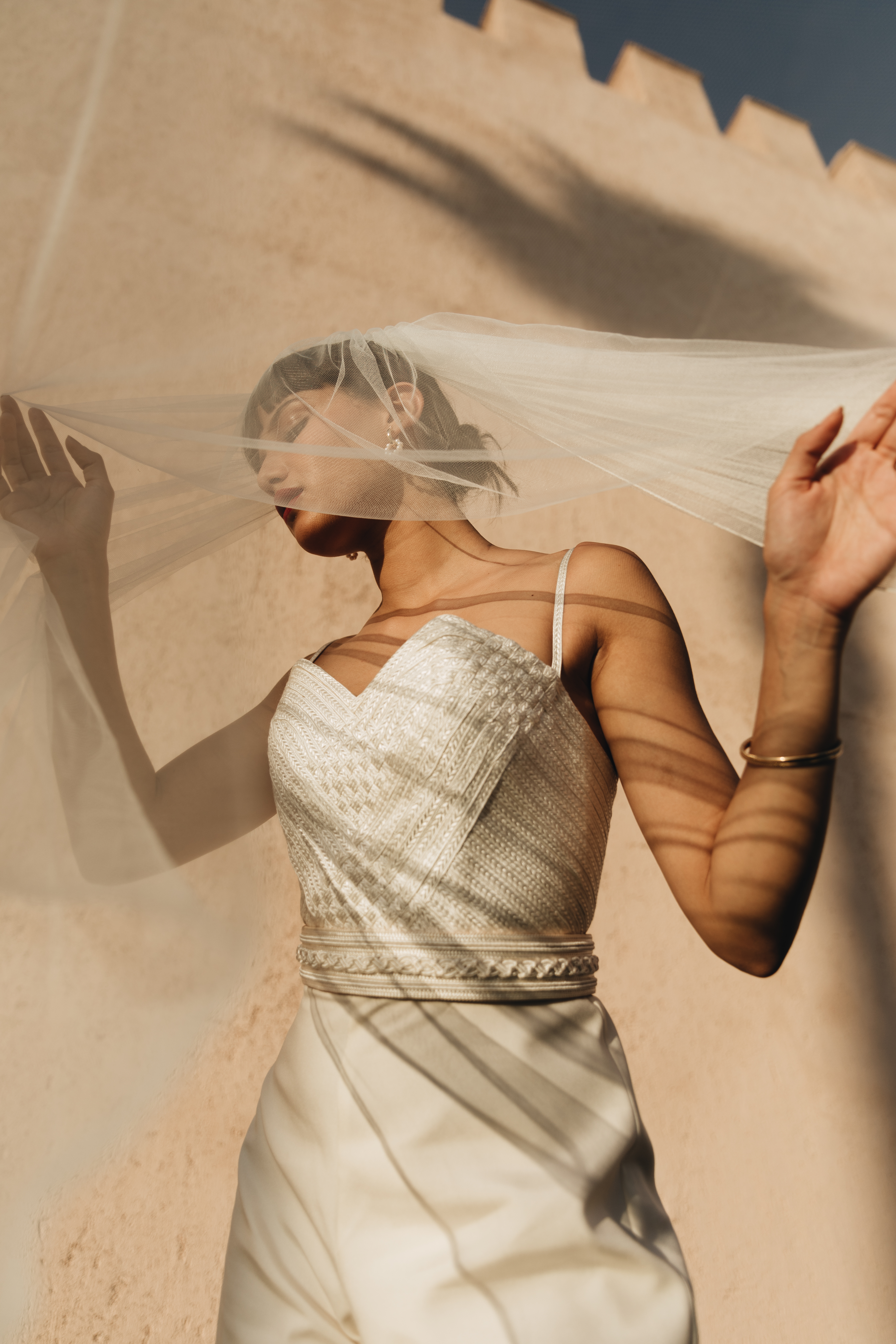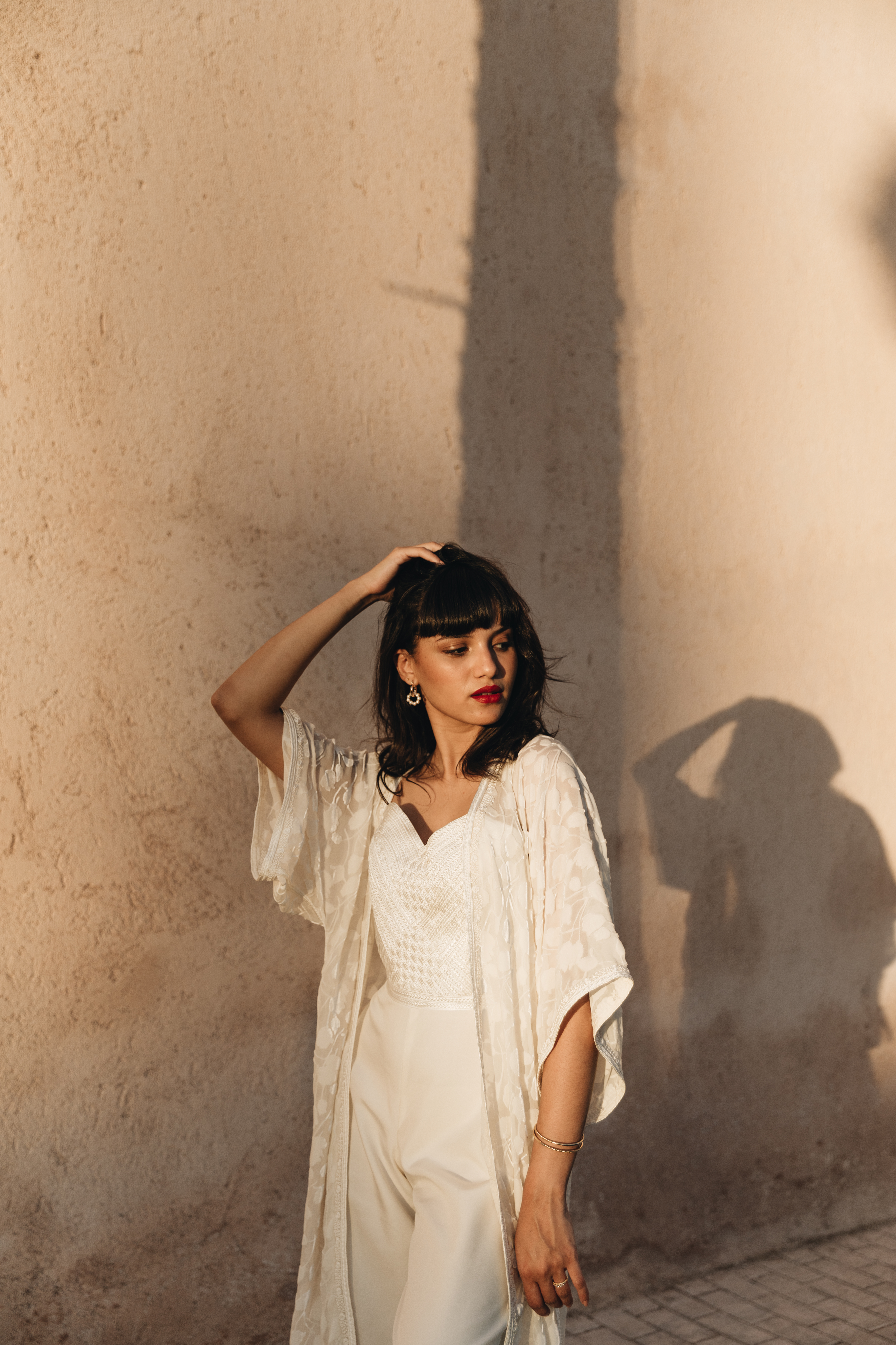 100% crepe de soie, tissage fait main du buste avec fines passementeries en fils de soie tressés “sfifa dfira”, bretelles amovibles.