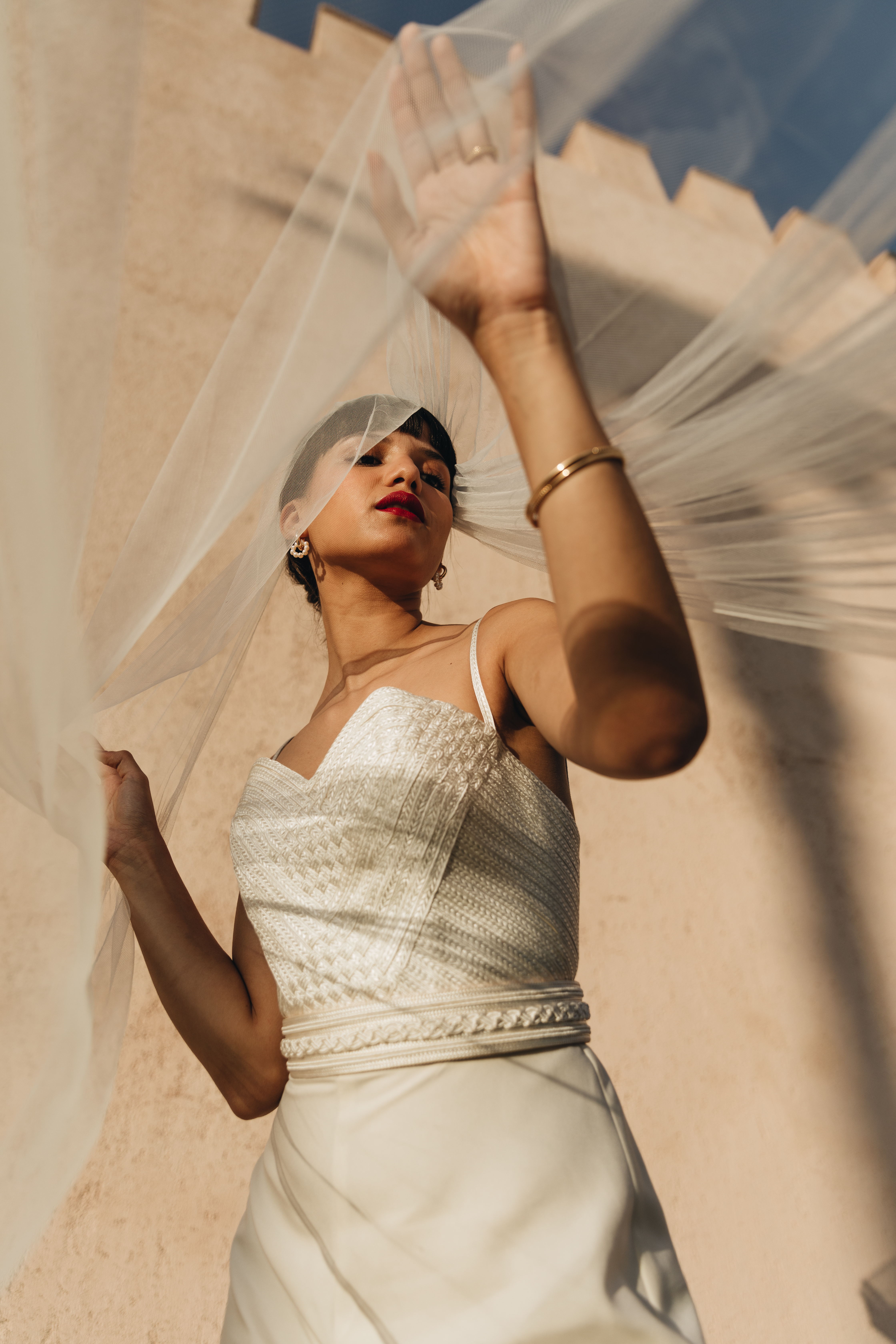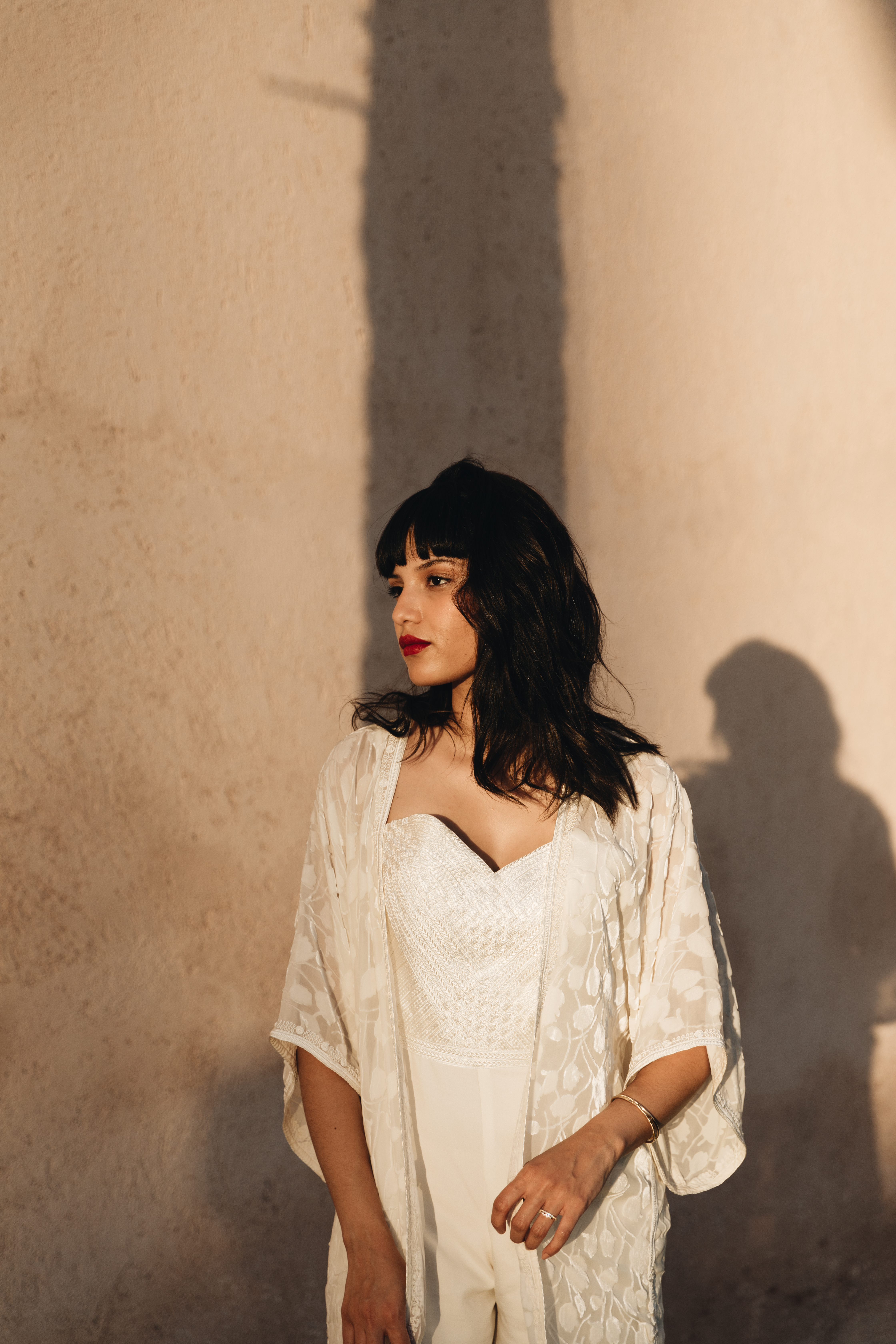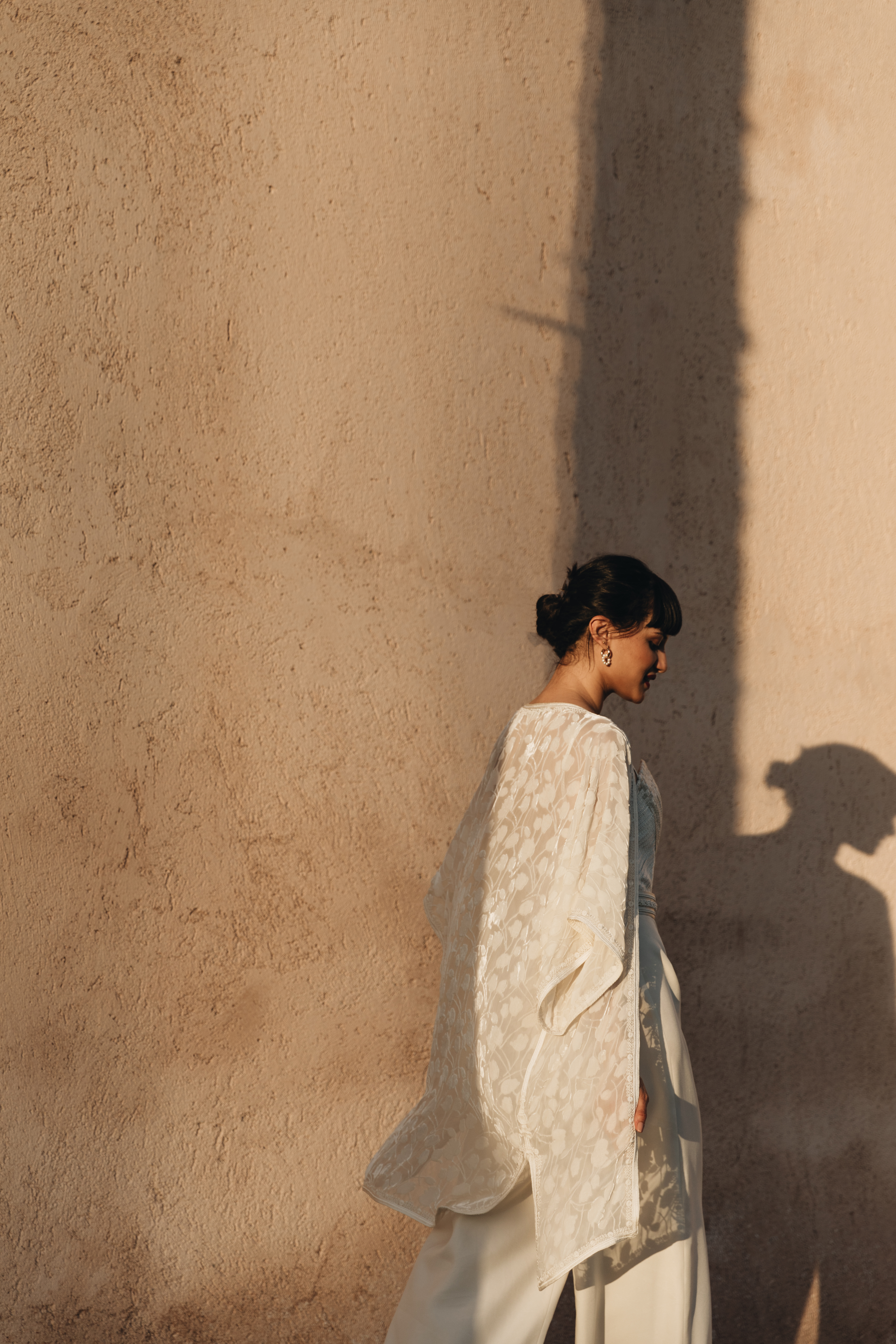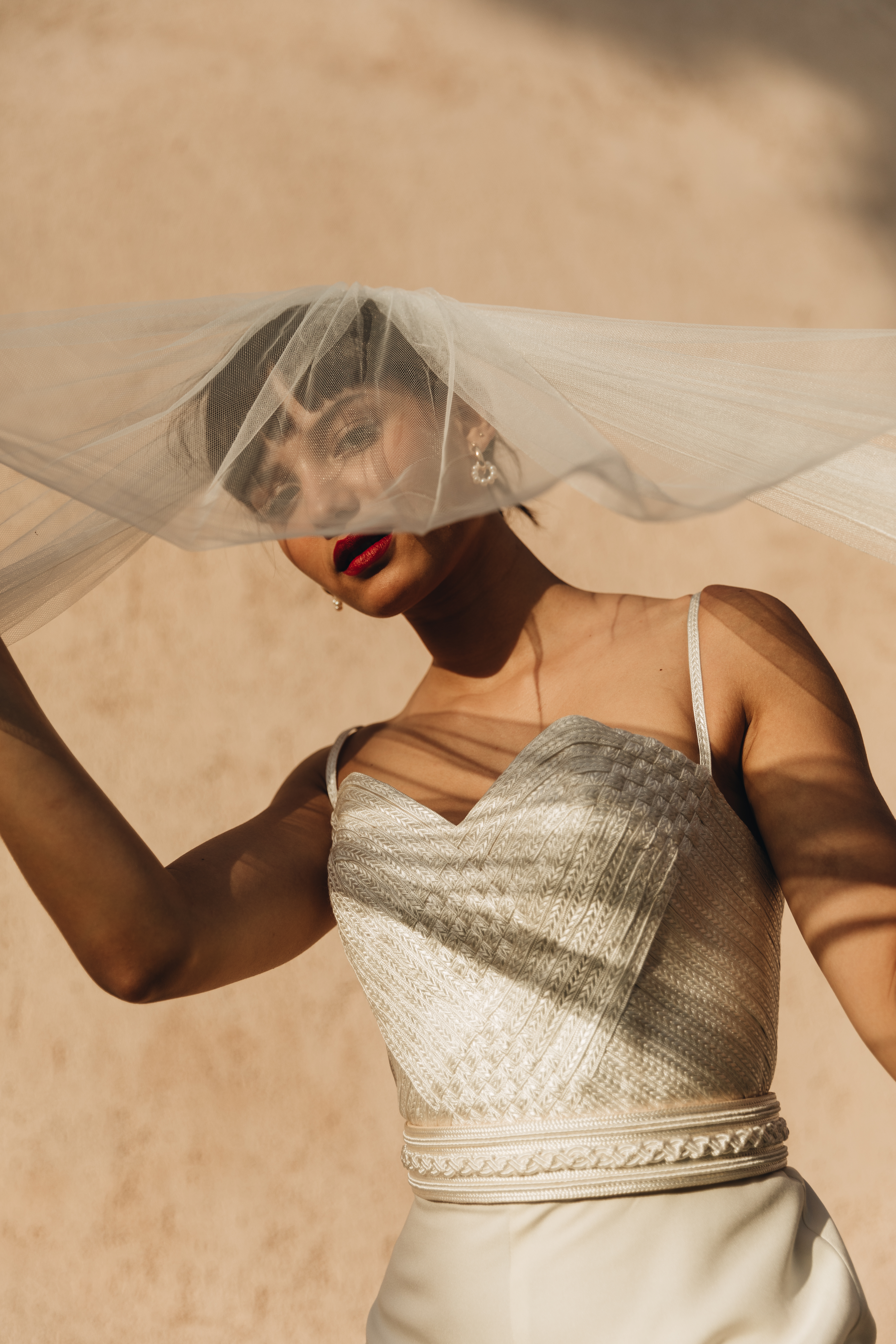 100% crepe de soie, tissage fait main du buste avec fines passementeries en fils de soie tressés “sfifa dfira”, bretelles amovibles.