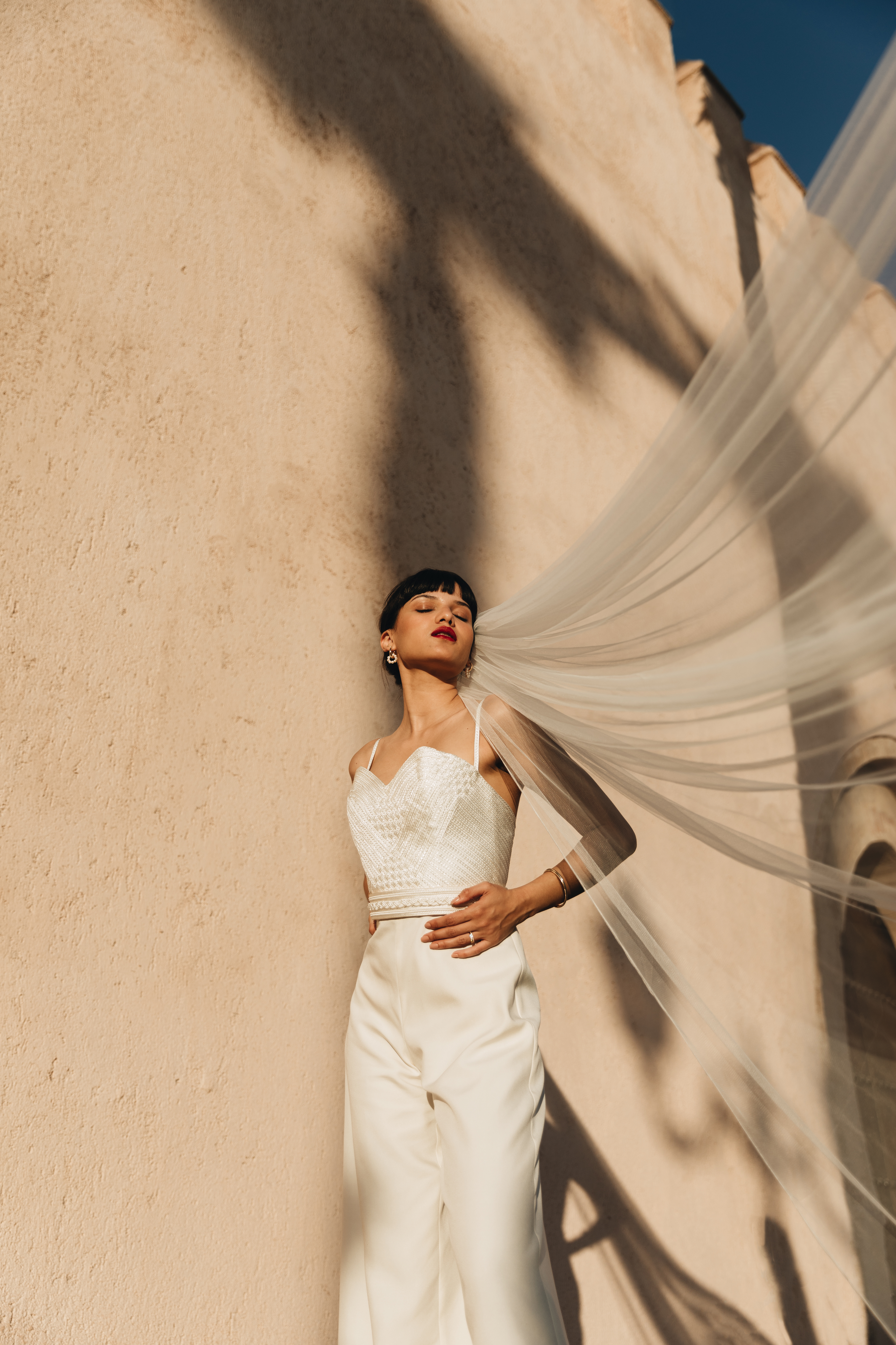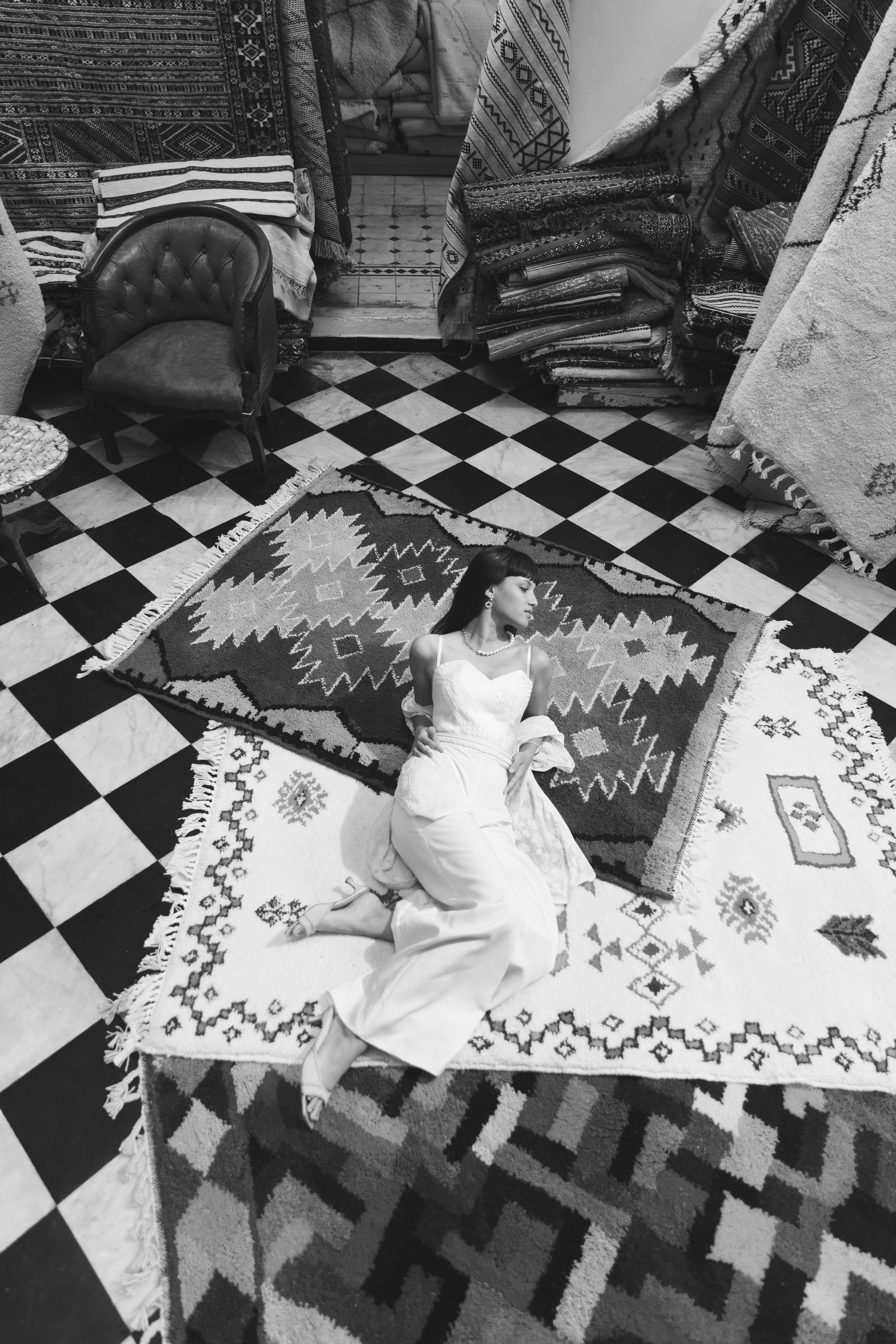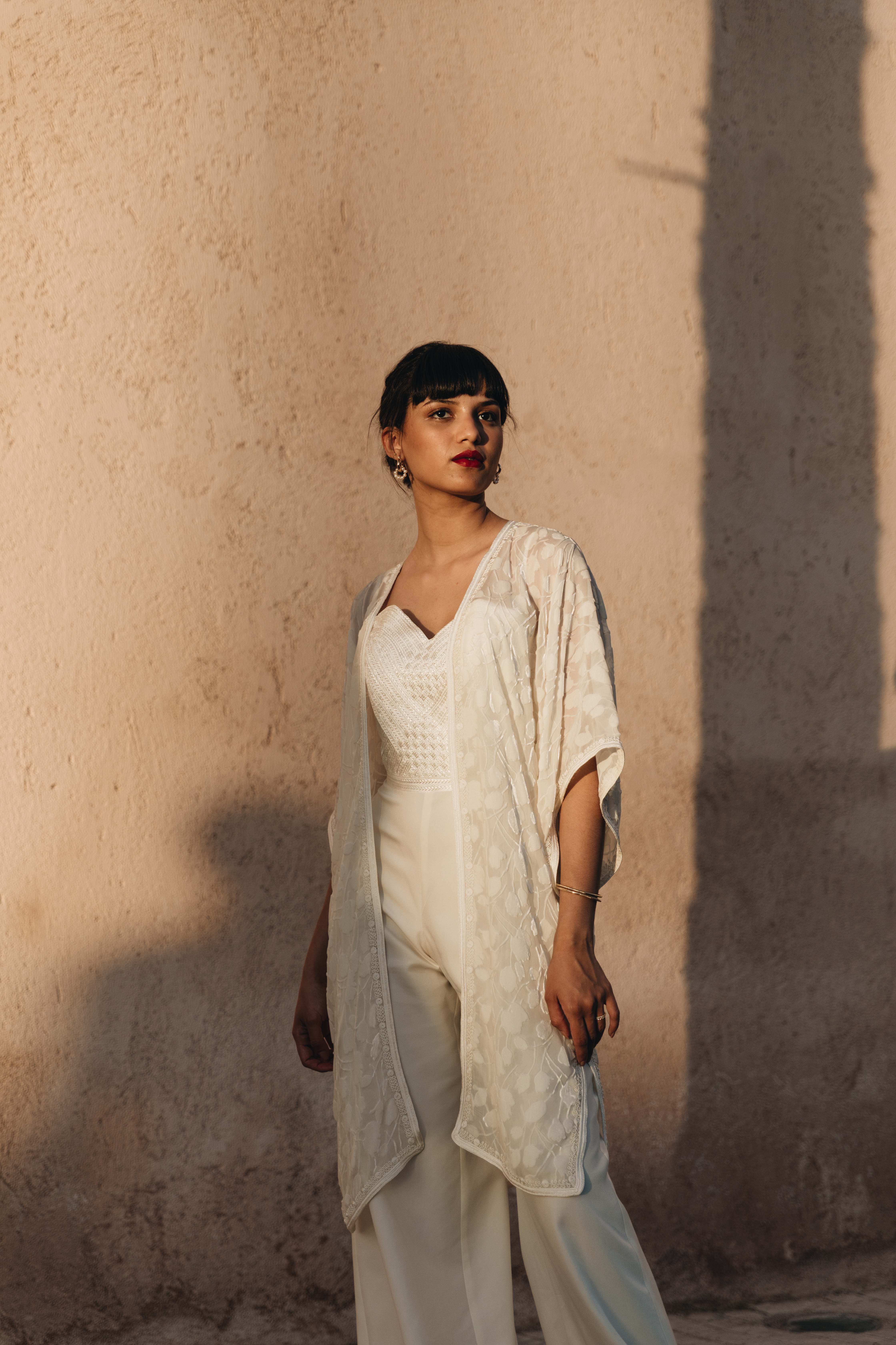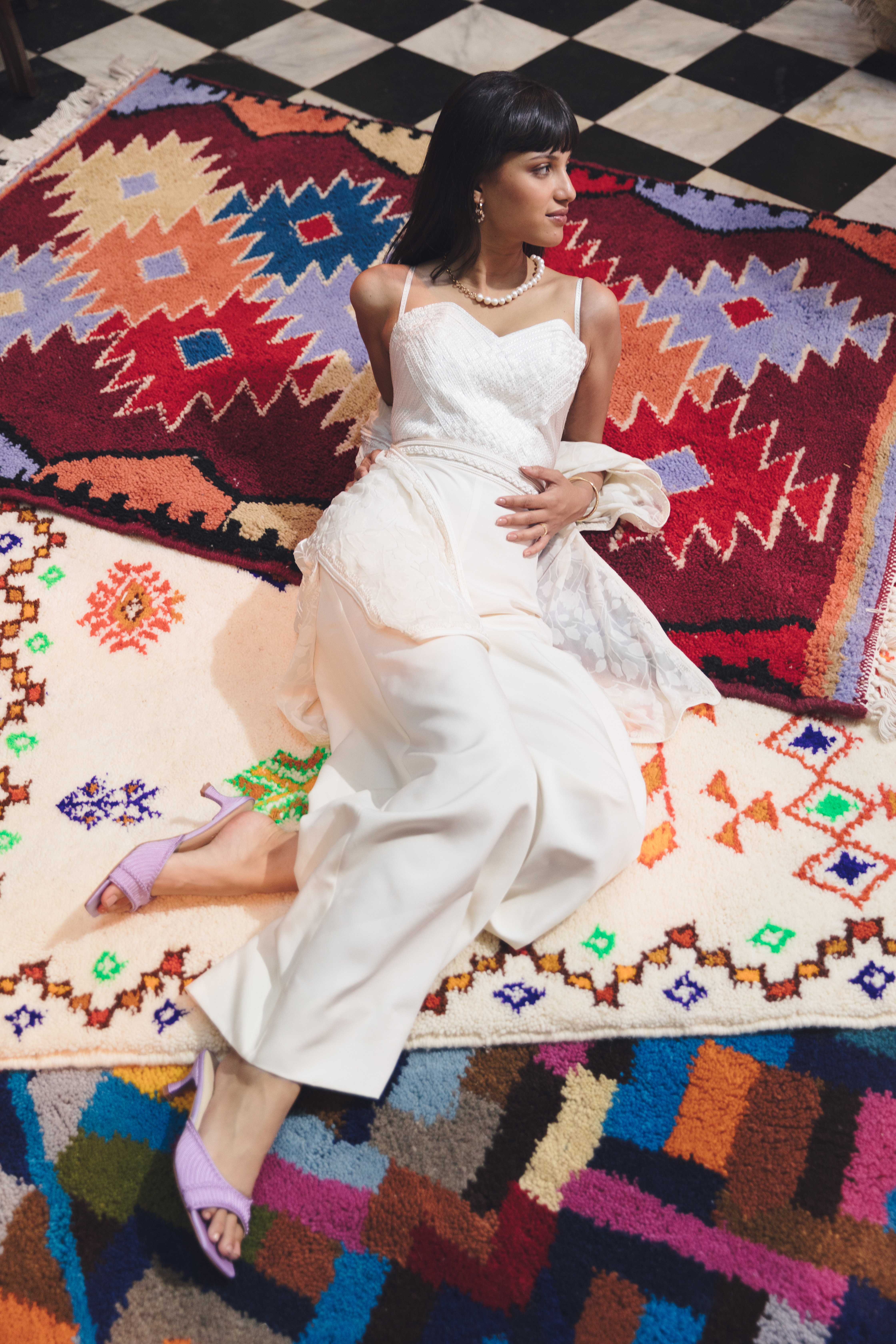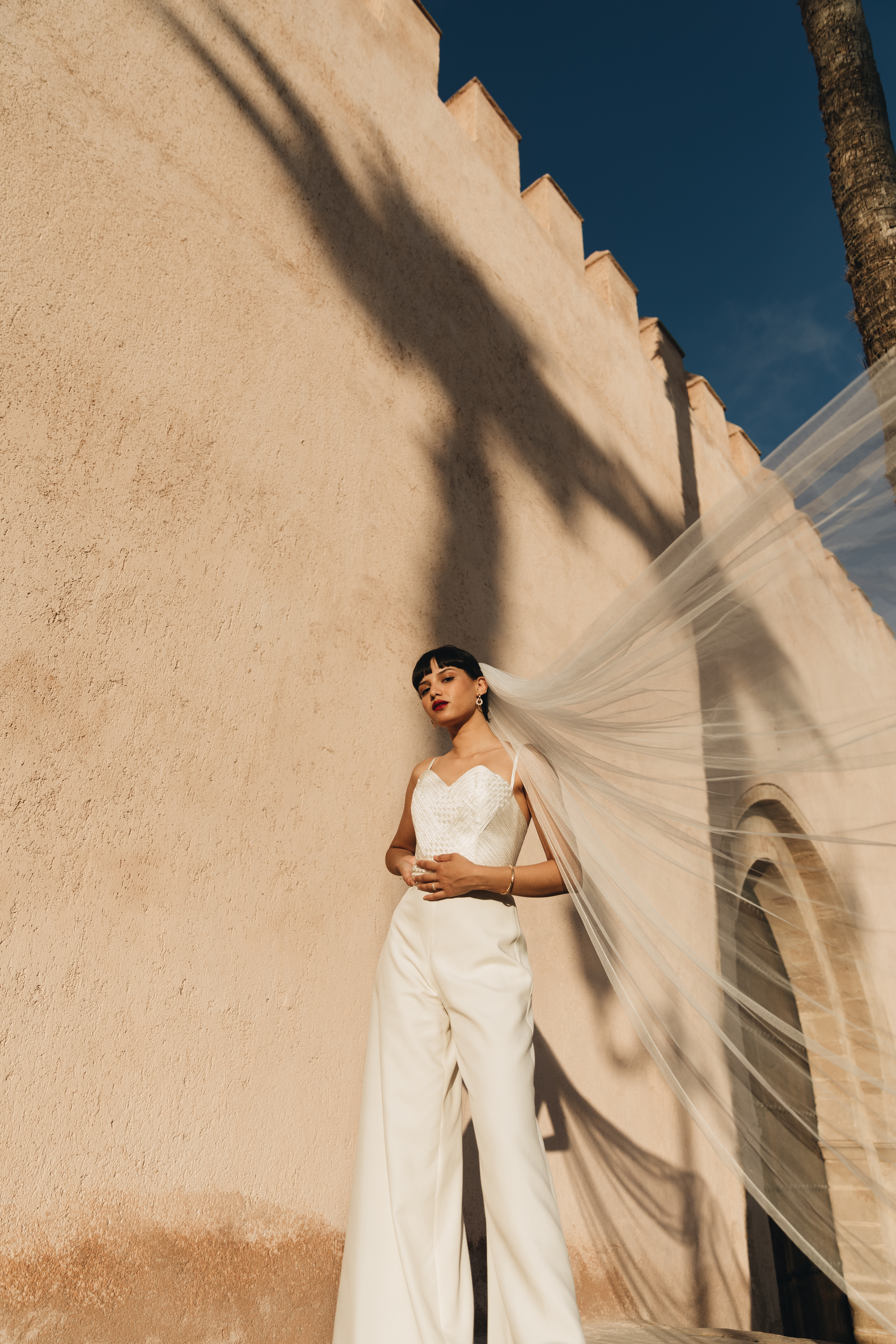 100% crepe de soie, tissage fait main du buste avec fines passementeries en fils de soie tressés “sfifa dfira”, bretelles amovibles.